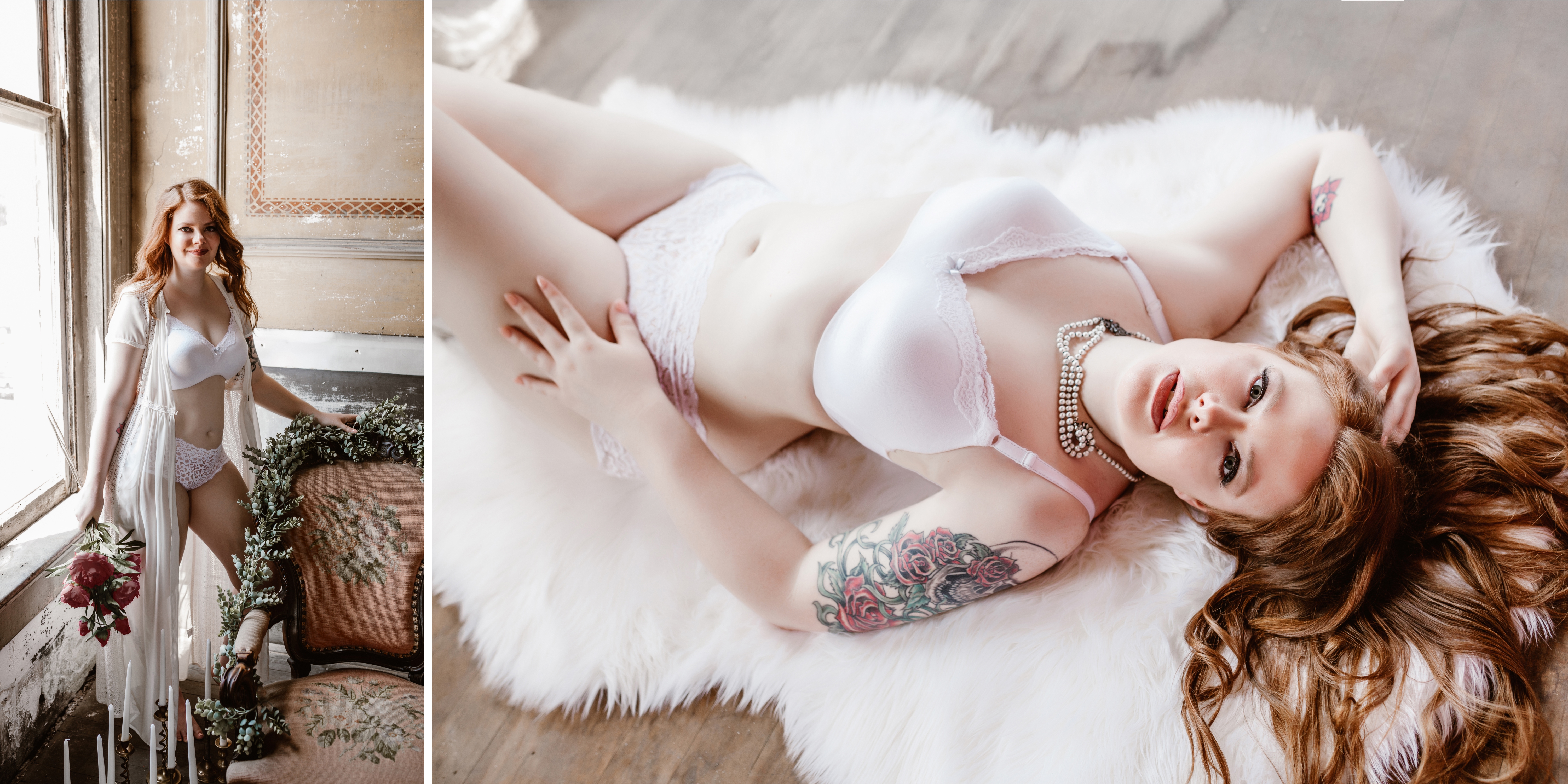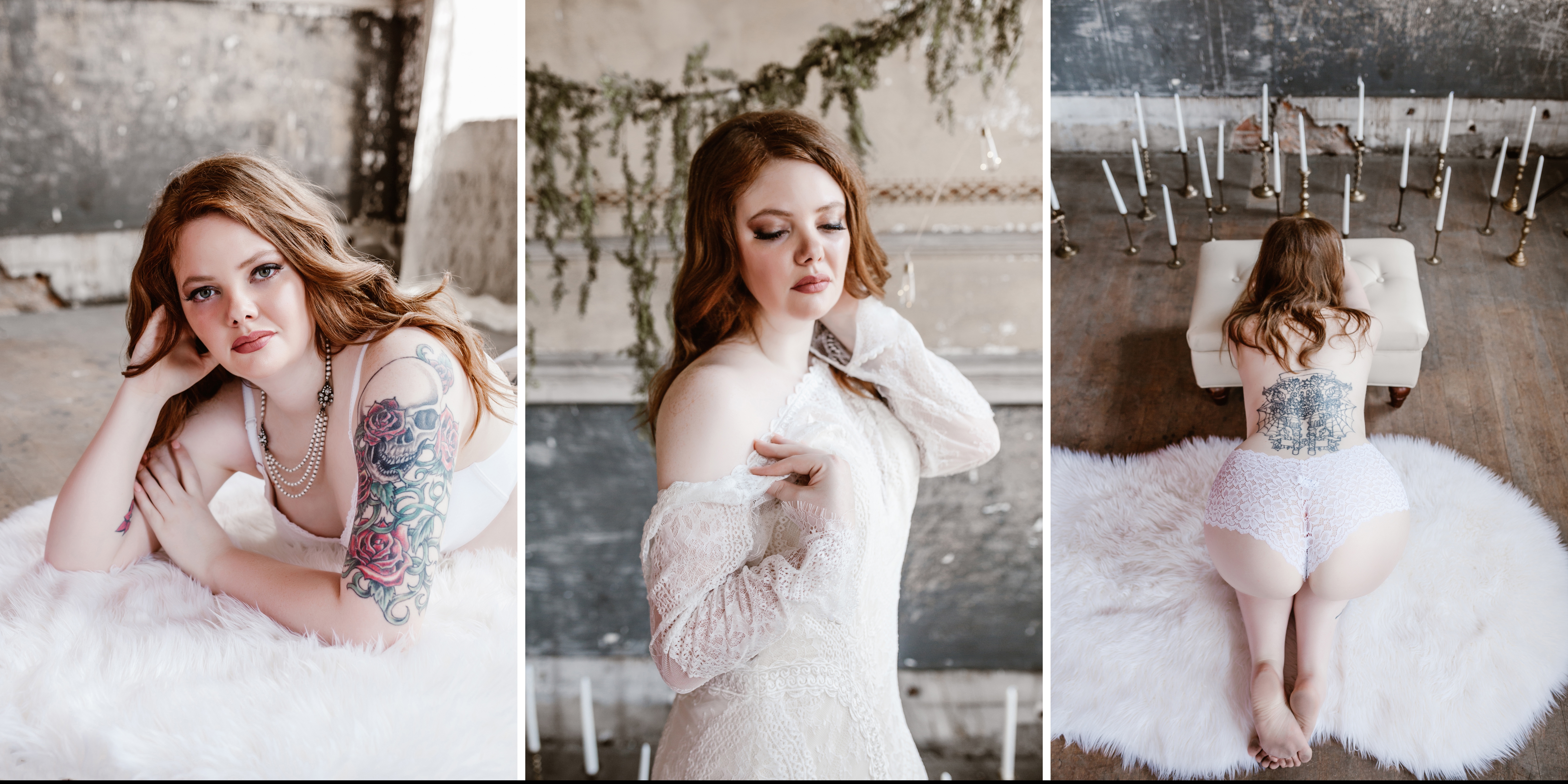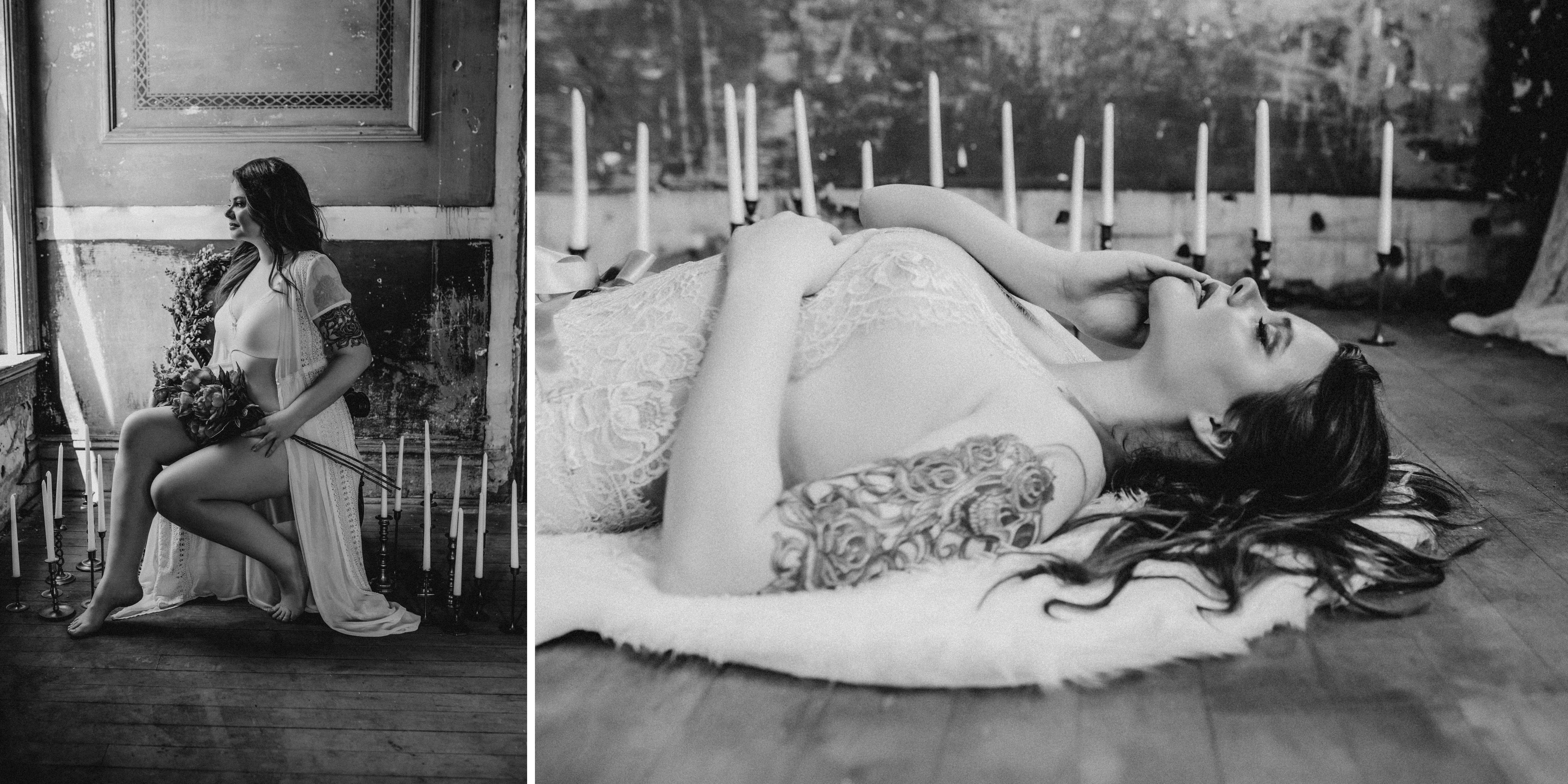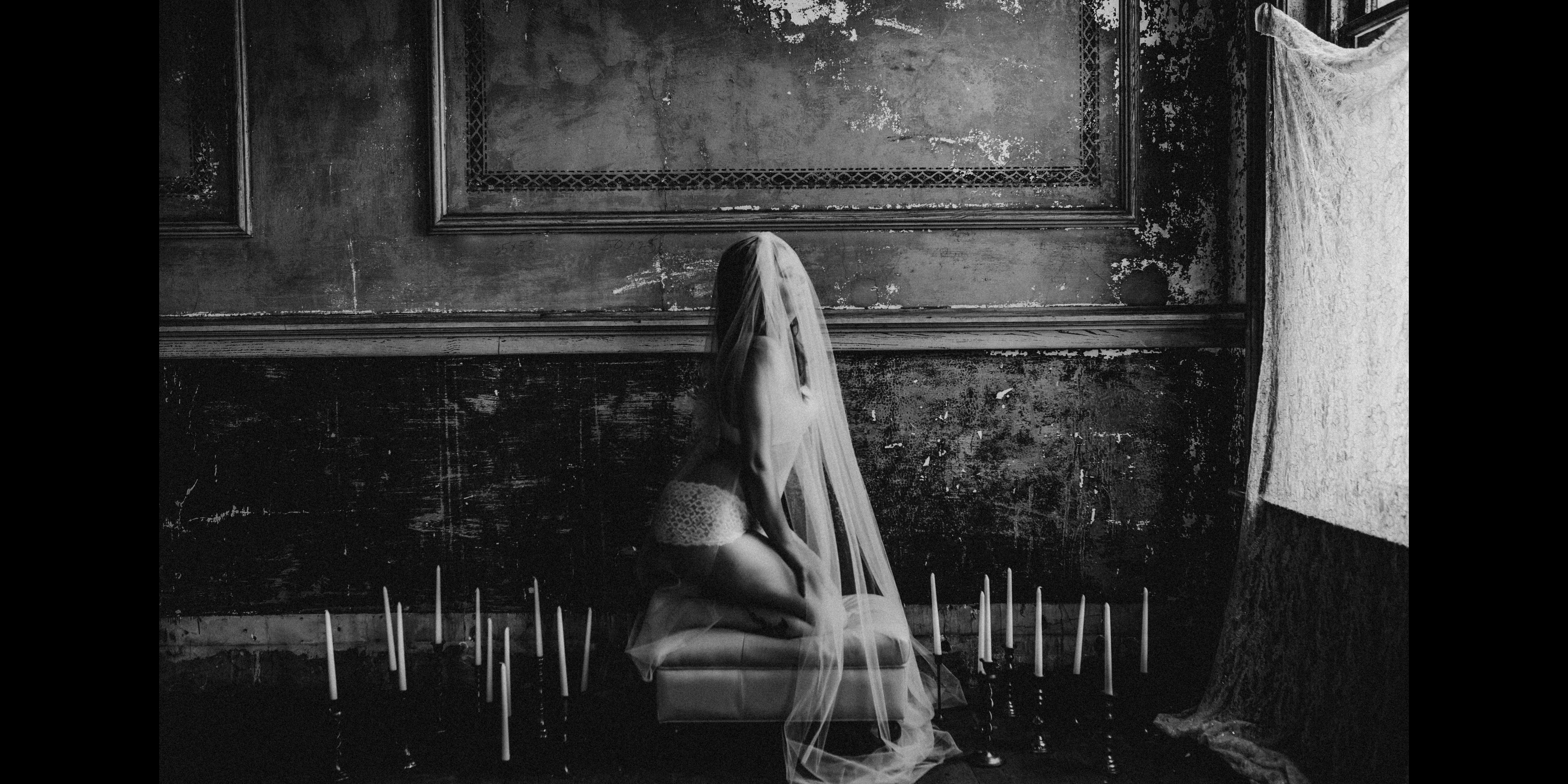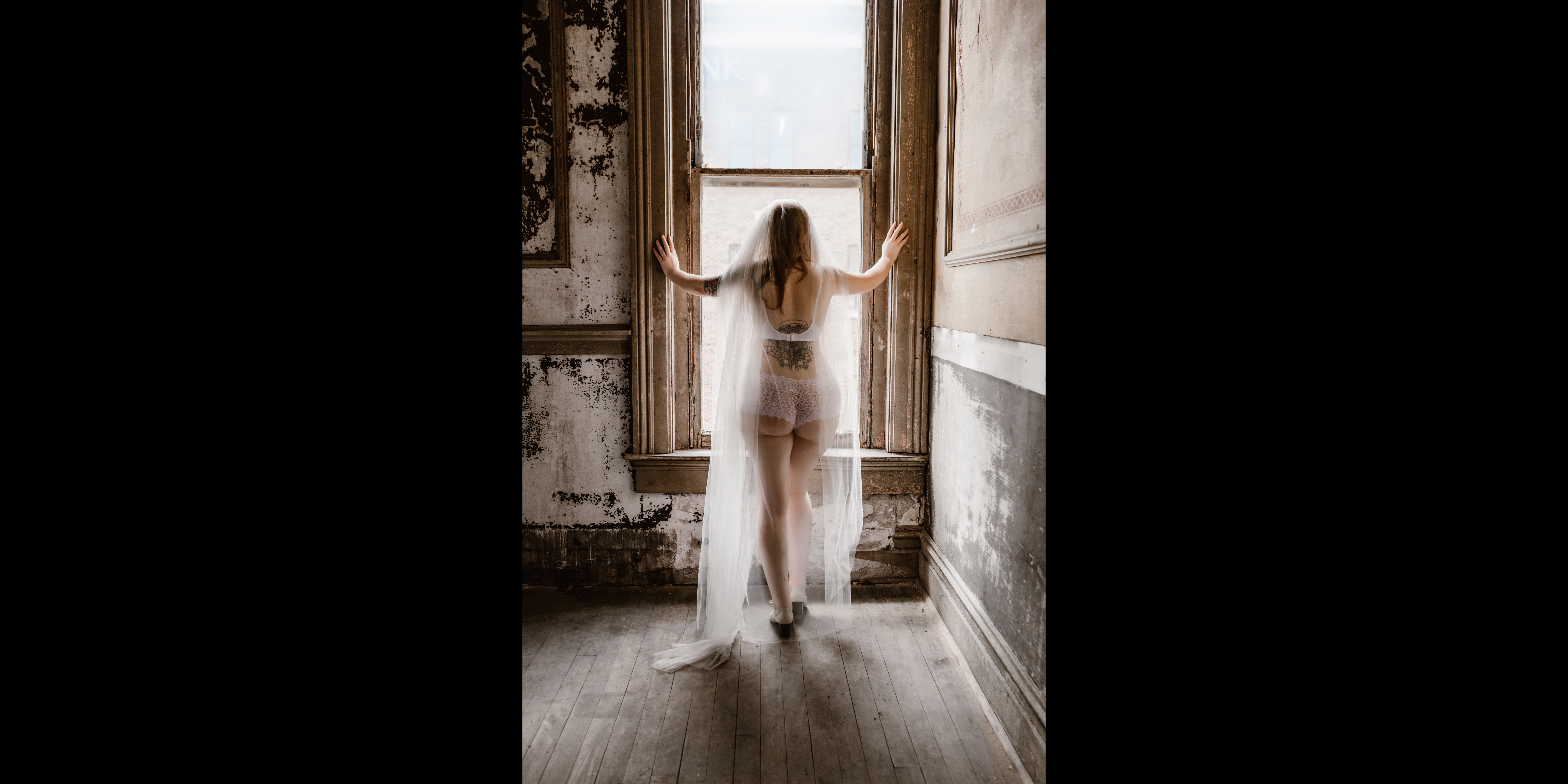 When this beauty came to see me, I knew we had to do something different! She wanted to incorporate some items from her upcoming wedding (the candlesticks) so we worked together to find the perfect location and the perfect ideas. Let me tell you, it was HOT but that didn’t discourage her from looking completely radiant the entire time. She chose to bring a two piece lingerie set and her wedding dress and shoes. The necklace, coverup, bodysuit and veil can all be found in the client closet!